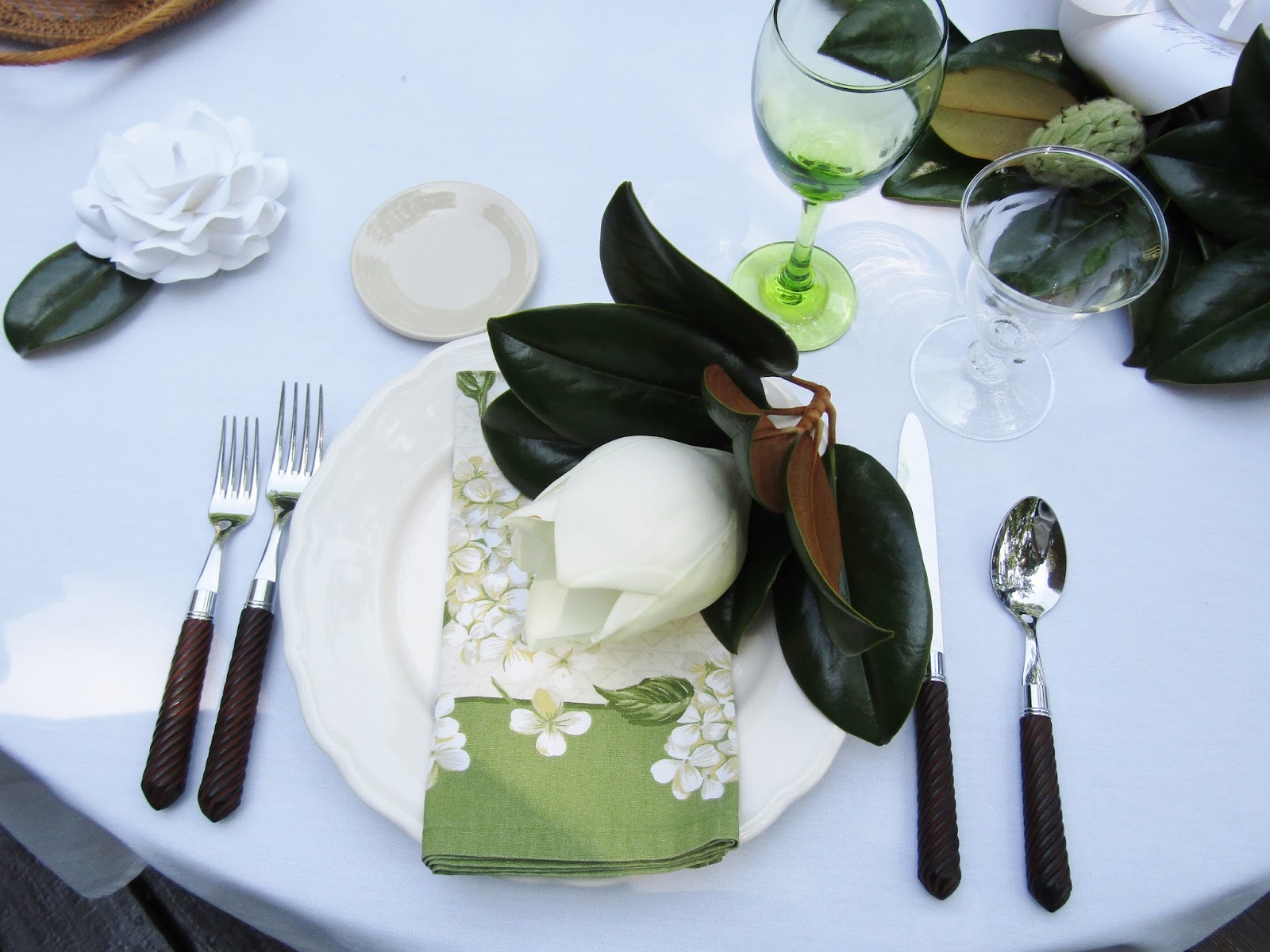 Here's the placesetting with a fresh magnolia. Aren't they beautiful? And they smell so good.